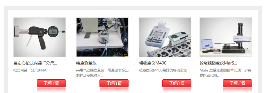 產(chǎn)品中心界面有清晰的產(chǎn)品類(lèi)目:通用量具,在線測(cè)量,精密設(shè)備,計(jì)量設(shè)備,理化試驗(yàn)等,每款產(chǎn)品